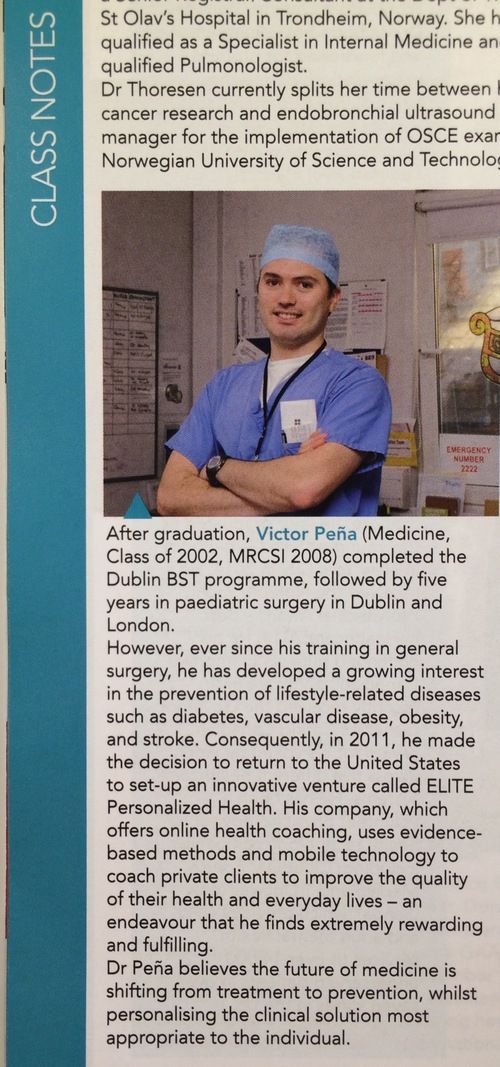 SPRING 2016, DUBLIN, IRELAND. Dr. Peña and his innovative health coaching have been featured on the alumni magazine of his medical alma mater, The Royal College of Surgeons in Dublin, Ireland.