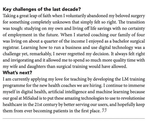 Lifestyle medicine was the two-word answer that I had never heard about. Soon after sharing my excitement about this new field with my wife, we took a great leap of faith. I decided to leave my beloved surgical career, move my young family back to the United States, live off our life savings, devour every continuing medical education course on lifestyle medicine that I could find, and figure out how to help people never experience the pain and suffering I had witnessed in my patients. After two years of re-skilling, I became a Lifestyle Medicine Health Coach, speaker, educator, and industry consultant. It has been ten years since that fateful day when I read that article. The journey thus far has been an exhilarating one with a steep learning curve and many wonderful highlights, such as launching my own business, earning my diplomate of the American College of Lifestyle Medicine, as well as delivering presentations to its wonderfully welcoming members at its annual meetings, and consulting with some innovative companies that are shaping our future. There have been many unexpected rewards throughout this adventure. I now lead a healthier and more balanced life that my wife and I share with our daughters and that aligns with my work, instead of competing with it. I continue to meet inspiring and like-minded professionals in this new field, and not a single day goes by when I don’t wake up excited to apply lifestyle medicine to improve my clients’ health and happiness.